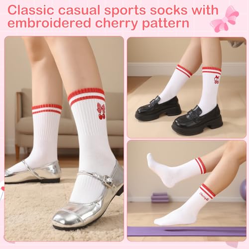 Jspupifip 6 Pairs Cute Cherry Crew Socks for Women Girls White Striped Crew Socks Funny Fruit Cotton Sock for Athletic Sports Running Casual Sock 4