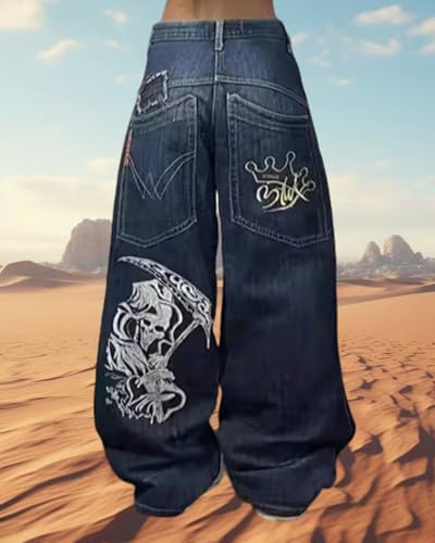 HOT ! Baggy Women Men Hip Hop Goth Street Y2k Jeans with Skeleton Print, Vintage High Waist Denim Wide Leg Pants Wear