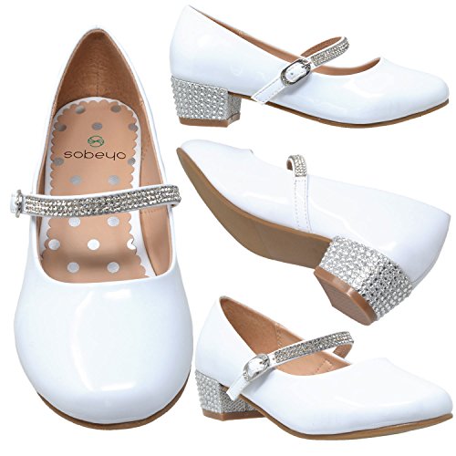 SOBEYO Kids Dress Shoes Low Chunky Heel Mary Jane Girls Pumps Rhinestone Strap 4