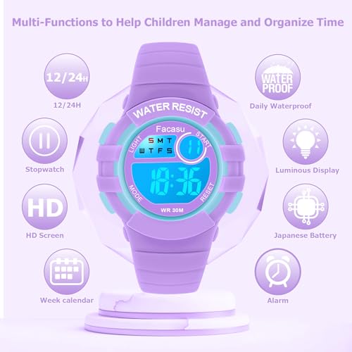 • Waterproof Kids Sport Watch: The Facasu children's watch has waterproof function.Each watch has been vacuum pressure tested and has 3 waterproof processes.It can be worn for daily indoor and outdoor activities such as washing hands and face,washing cars,getting wet in the rain,splashing water,sweating sports,surfing,swimming pools,etc (Note: It cannot be used at high temperatures,and the knob cannot be pulled out in water.)