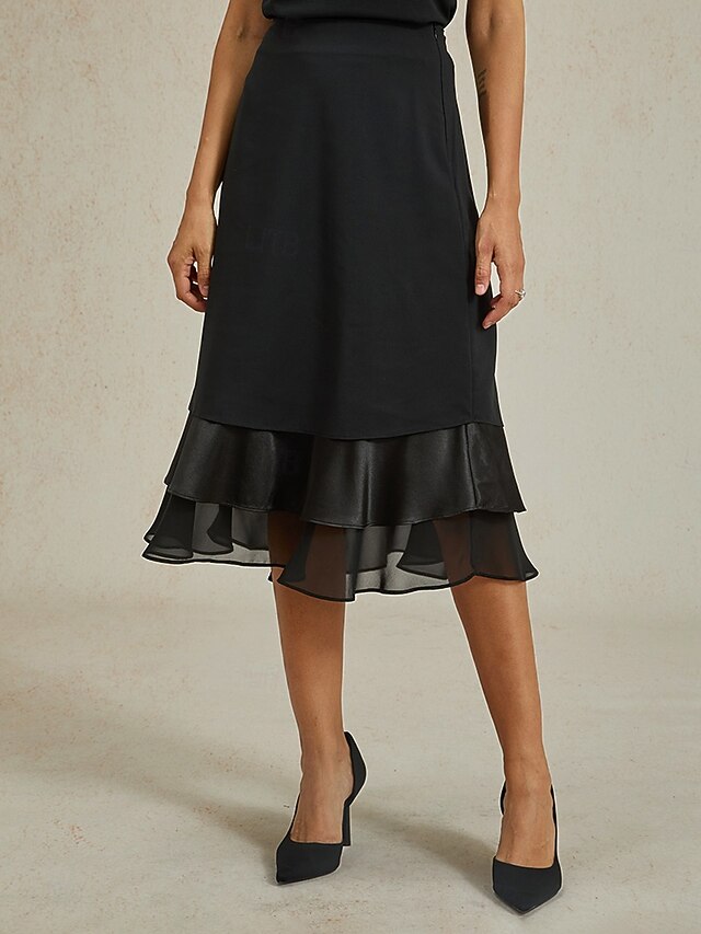 HOT ! Women's A Line Elegant Fashion Midi Mid Waist Skirts Ruffle Layered Inelastic Valentine's Day New Year Black Spring Chiffon
