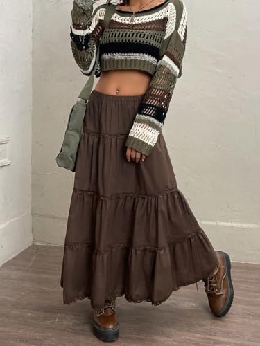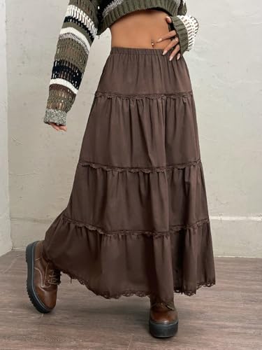 • Woven Fabric / Contrast Lace, Tiered Layer, Ruffle Hem / Unlined / Layered/Tiered / No / Casual / Machine wash or professional dry clean / Chocolate Brown / Long / Comfortable, Breathable, Skin-friendly, Soft / Natural(Mid Waist) / Cotton