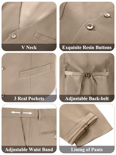 • Details: Herringbone Tweed Wool Suit Jacket: 2 button closure, notched lapel, 1 chest pocket that needs to be removed (please be careful not to cut the clothes), 2 flap pockets. Polyester Suit Vest: v-neck, 1 chest pocket, 2 wide sided pockets, adjustable back belt. Solid Polyester Dress Pants: Double safety buckle - zipper + button, micro-stretch waistband, 4 pockets.