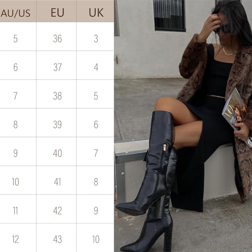 HOT ! MUCCCUTE Knee High Boots Women Chunky High Heel Pointed Toe Fashion Faux Crocodile GoGo Boots, Block Heeled Boots with Side Zipper Pull-On