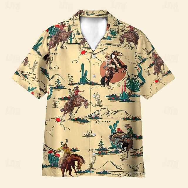 Kentucky Derby Men's Cowboy Horse Racing Shirt Cuban Collar Shirt Short Sleeve Vintage Retro Vacation Holiday Festival Summer Spring Camp Collar Shirt 3D Print Funny Kentucky Derby Shirts Light Yellow 7