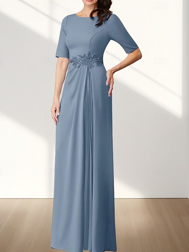 A-Line Mother of the Bride Dress Wedding Guest Elegant Crew Neck Floor Length Chiffon Stretch Fabric Half Sleeve with Appliques Ruching 1