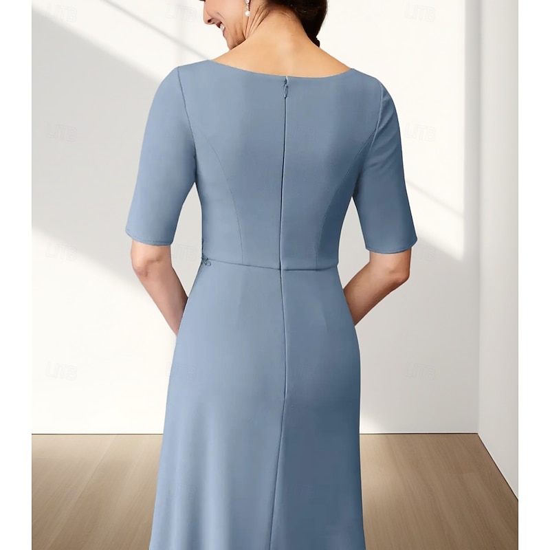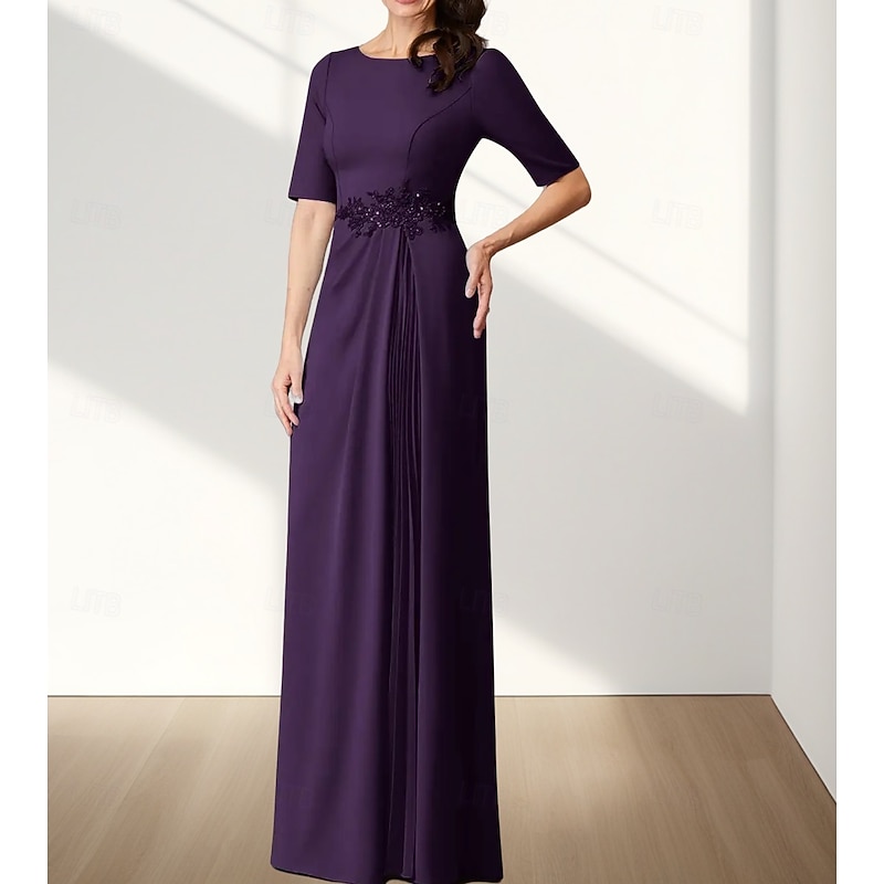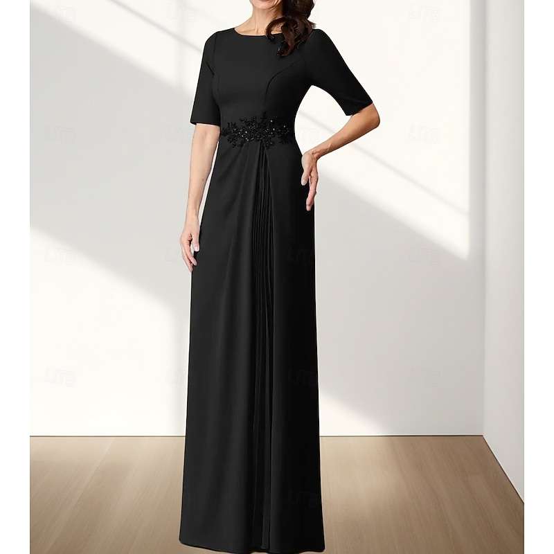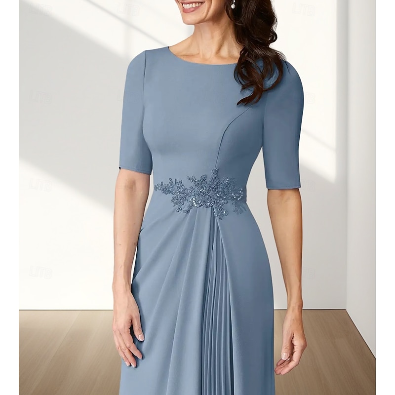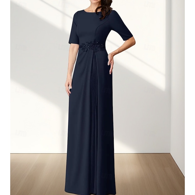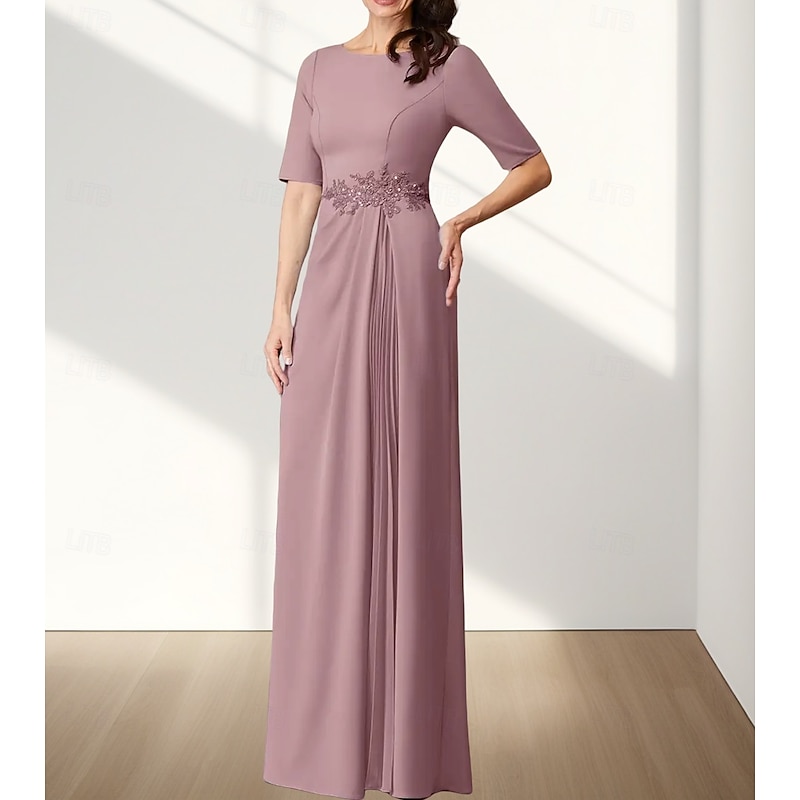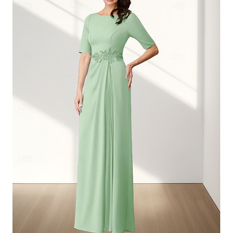 More information about A-Line Mother of the Bride Dress Wedding Guest Elegant Crew Neck Floor Length Chiffon Stretch Fabric Half Sleeve with Appliques Ruching