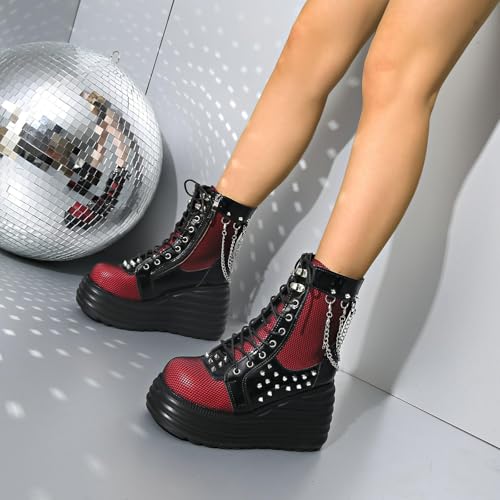 Women's Gothic Combat Ankle Boots Chain Buckle Lace Up Round Toe Platform Chunky Wedge Booties Punk Motorcycle Boots 7