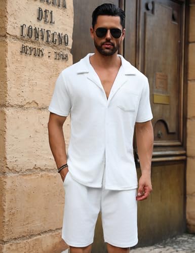 URRU Mens Short Sets 2 Piece Outfits Summer Beach Terry Short Sleeve Button Down Shirt and Shorts Set