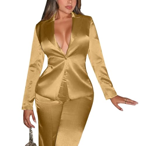 Women's Satin Suit 2 Piece Shiny One Button Blazer Pants Sets Solid Casual Outfits Jacket Pants 2