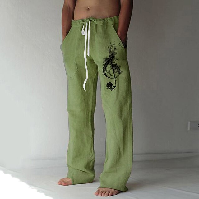 Highlights [Fabric]: Crafted from a breathable linen fabric, these pants are designed for comfort and style, making them an excellent choice for warmer seasons. [Fit]: Featuring a regular fit with a mid-rise waist, the trousers offer a blend of classic style and modern streetwear appeal, perfect for everyday casual wear. [Design Highlights]: These pants showcase an artistic graphic print of a treble clef on one leg, adding a unique touch of creativity to your outfit. They come with an adjustable drawstring waistband and two side pockets, combining functionality with a designer aesthetic. [Occasions]: Ideal for a variety of settings, from holiday getaways to casual daily wear. Whether you're lounging at home, taking a stroll on the beach, or enjoying a day out, these pants offer versatility and style for any occasion. [Size Range]: Available in a wide range of sizes from S to 3XL, ensuring a comfortable fit for a diverse range of body types.