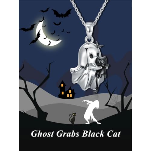 - PREMIUM DESIGN: Charming ghost pendant necklace crafted from zinc alloy with black crystal accents, featuring a cute ghost holding a black cat design