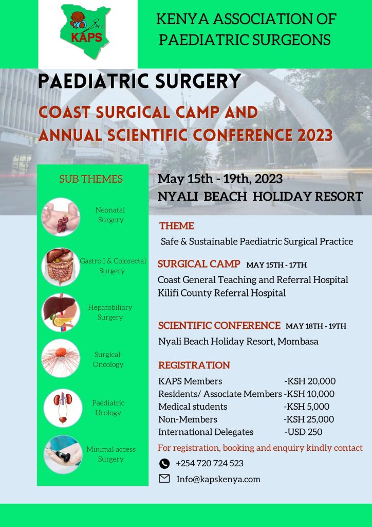 From 15–17 May 2023, KAPS held a joint camp at Coast General Teaching and Referral Hospital and Kilifi County Referral Hospital. A multidisciplinary team of 62 specialists operated on 108 paediatric patients across 100 procedures. The camp significantly reduced the surgical waiting list and enhanced paediatric surgical capacity within both counties. Key partners included the County Governments of Mombasa and Kilifi, Mombasa Cement, Cerba Lancet, KidsOR, Karl Storz, Prota, Kenyatta National Hospital, Gertrude’s Children’s Hospital, and other corporate and charitable supporters.